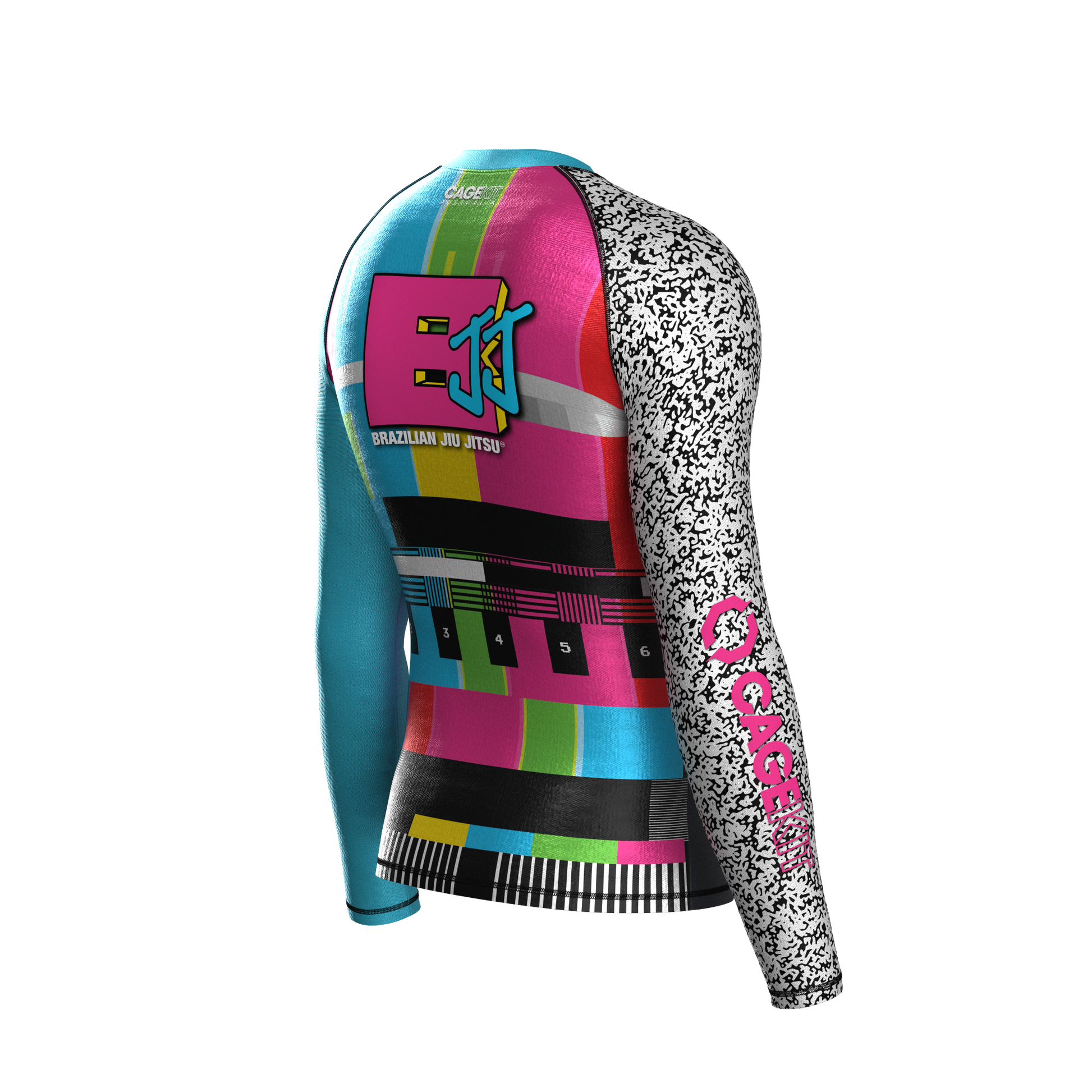 The CKTV Range channels the rebellious spirit of MTV with a bold black base and vibrant light blue accents. Featuring a "BJJ" logo on the back styled after the classic MTV emblem, the design is amplified by a "TV static" pattern on the arms and a nostalgic TV test screen graphic across the back. The phrase "Play Your Guillotine" runs down the arm, a playful nod to the iconic lyric "Play your guitar on the MTV," blending jiu-jitsu flair with music channel swagger. Perfect for warriors battle-tested by the toughest rolls, this range is a knockout mix of style and performance.