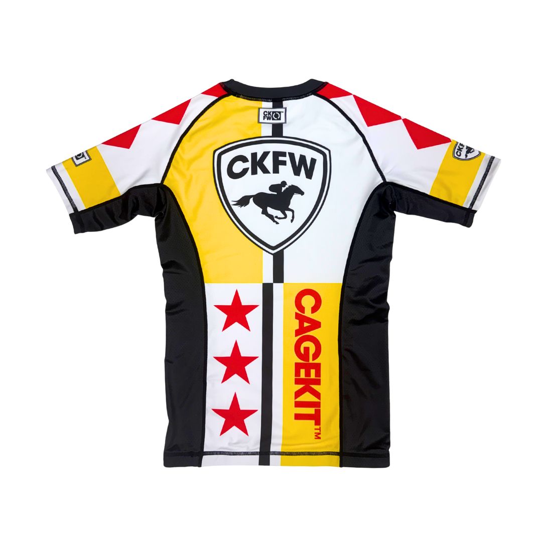 Short-Sleeve Rash Guard: Crafted from ultra-durable, moisture-wicking fabric with flatlock seams for ultimate comfort and mobility. Our OG buttery-soft rash guard material is a must. Bold geometric design in fiery red, vibrant yellow, crisp white, and deep black, accented by our signature galloping horse emblem and race-inspired details for prosperity and victory.